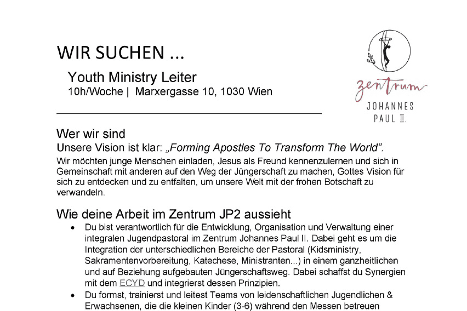 WIR SUCHEN ... Youth Ministry Leiter 10h/Woche | Marxergasse 10, 1030 Wien Wer wir sind Unsere Vision ist klar: „Forming Apostles To Transform The World”. Wir möchten junge Menschen einladen, Jesus als Freund [...]