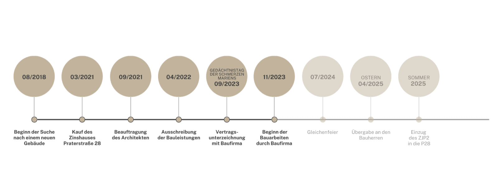 Timeline. Das erste große Fest der Gemeinde in der Praterstraße 28 soll Ostern 2025 stattfinden. Es wird erwartet, dann die Schlüssel zum fertigen Gebäude erhalten zu haben. Danach beginnen der Einzug und die Möblierung.